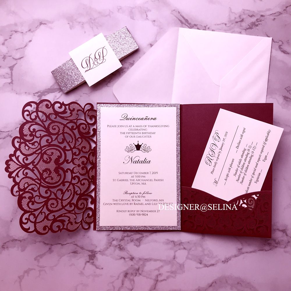 Burgundy Wedding Invitations Silver Glitter Laser Cut Invitation