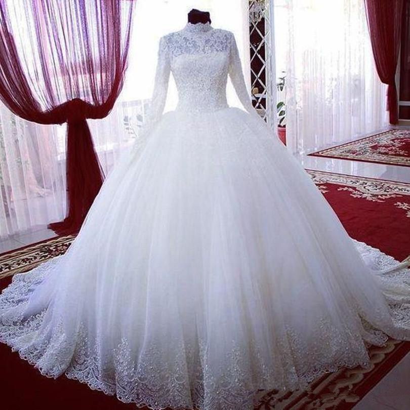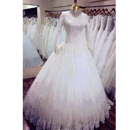 High Collar Modern Style Ball Gown Lace Muslim Wedding Dress Long